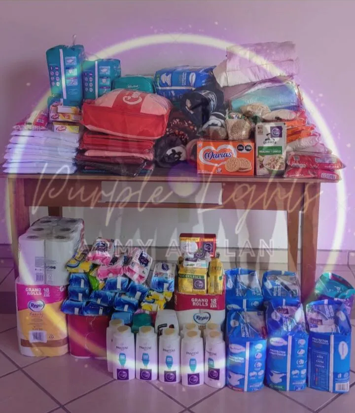 «En especie se recaudó aproximadamente 16 bolsas de pañales, 18 paquetes de toallitas húmedas, 7 paquetes de jabón de baño, 10 botes de shampoo y 3 paquetes de rollo, algunas toallas, algunas frazadas, paquetitos con avena y galletas de animalitos», comentó la presidenta de Purple Light’s Duvy Torres.