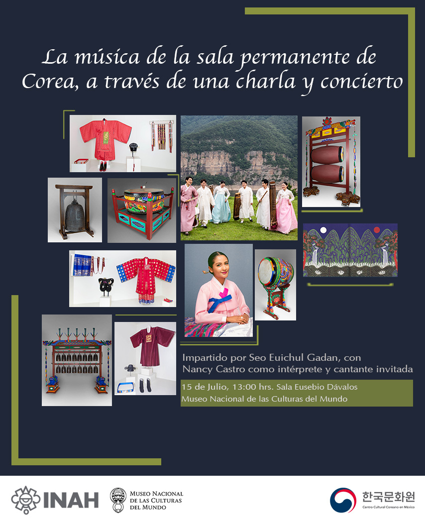El Museo Nacional de las Culturas del Mundo y el Centro Cultural Coreano en México, se complace en invitarlos a:"La música de la sala permanente de Corea, a través de una charla y un concierto".