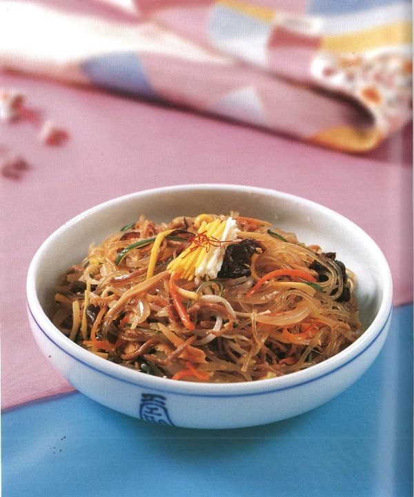 El Japchae es un plato elaborado con fideos de almidón, verduras y carne. Éste se servía en las festividades o días tradicionales con pepino, nabo, brotes de judías de soja, y raíces de campánula, etc, siendo un plato de origen real; en la modernidad se le agrega como ingrediente principal fideos de almidón de patata.